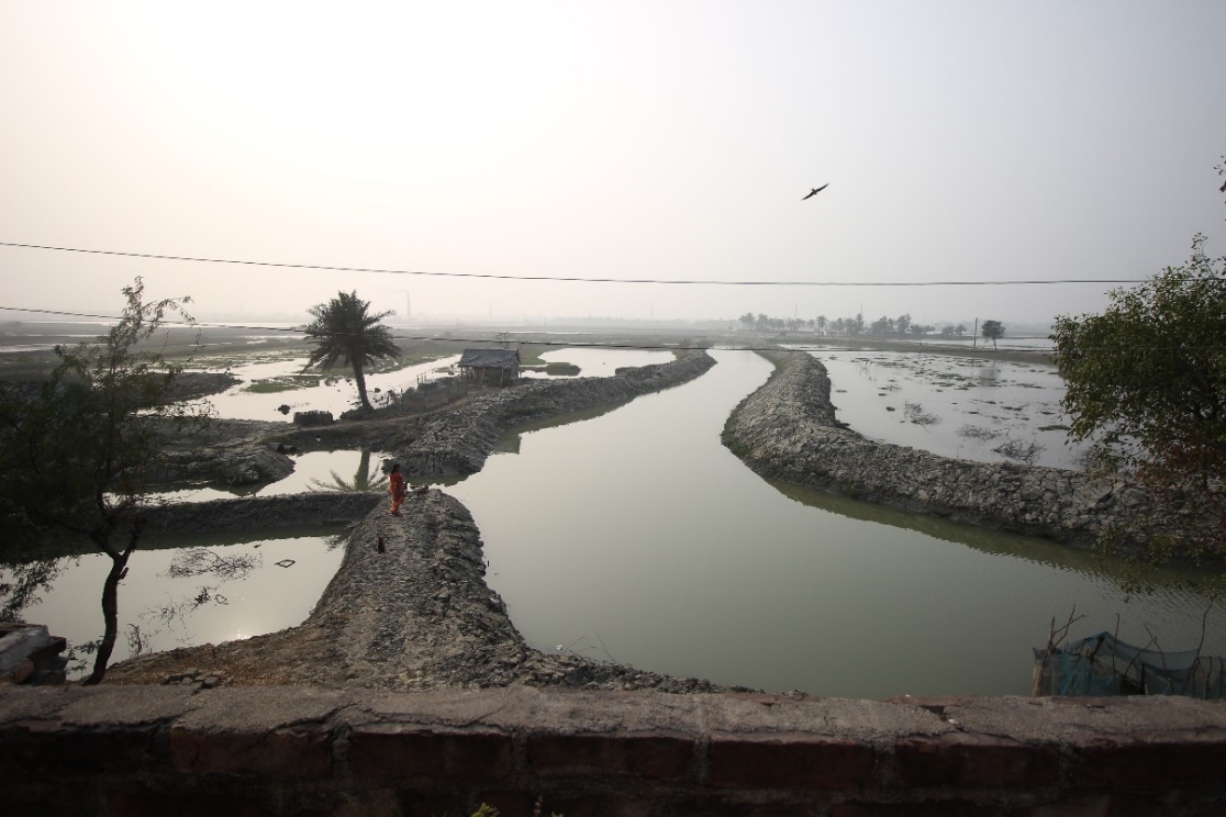 Incidentally, with government encouragement acres of traditional cultivable land in the Sundarbans has been rapidly brought under aquaculture schemes since 1991. This is mostly owing to the scheme’s ability to tackle livelihood issues and support national economic interests by catering to high international demand for frozen shrimp. As a result, a database compiled to document the economic progress made since the introduction of the scheme shows that the most extensive land conversion into aquaculture was reported to have occurred in Minakhan between 1986 and 2004 (Chopra, Kapuria, and Kumar 2009, 95). Further, 33,000 hectares of land in North 24 Parganas, along with 12,000 hectares in South 24 Parganas, have been used for shrimp farming with a potential for more (Chopra, Kapuria, and Kumar 2009, 110). For many, shrimp and fish farming rescues them from the threat of livelihood loss. Every year, self-help groups, fish workers’ forums, and village cooperatives from rural communities in the region report success stories of coming together to pool meagre sums of money to venture into common fishpond farming during the season. Tiger widows,[27] women fishers, men who want to improve their livelihood, or fishers looking to avoid a tussle with the State Government’s Forest Department over the acquisition and renewal of a license to enter the Sundarbans mangrove forests, have found a sustainable livelihood in the aquaculture industry. Many NGOs also collaborate with villagers to provide relief and skills to assist them to preserve and promote knowledge of local fish farming techniques while empowering those in need.