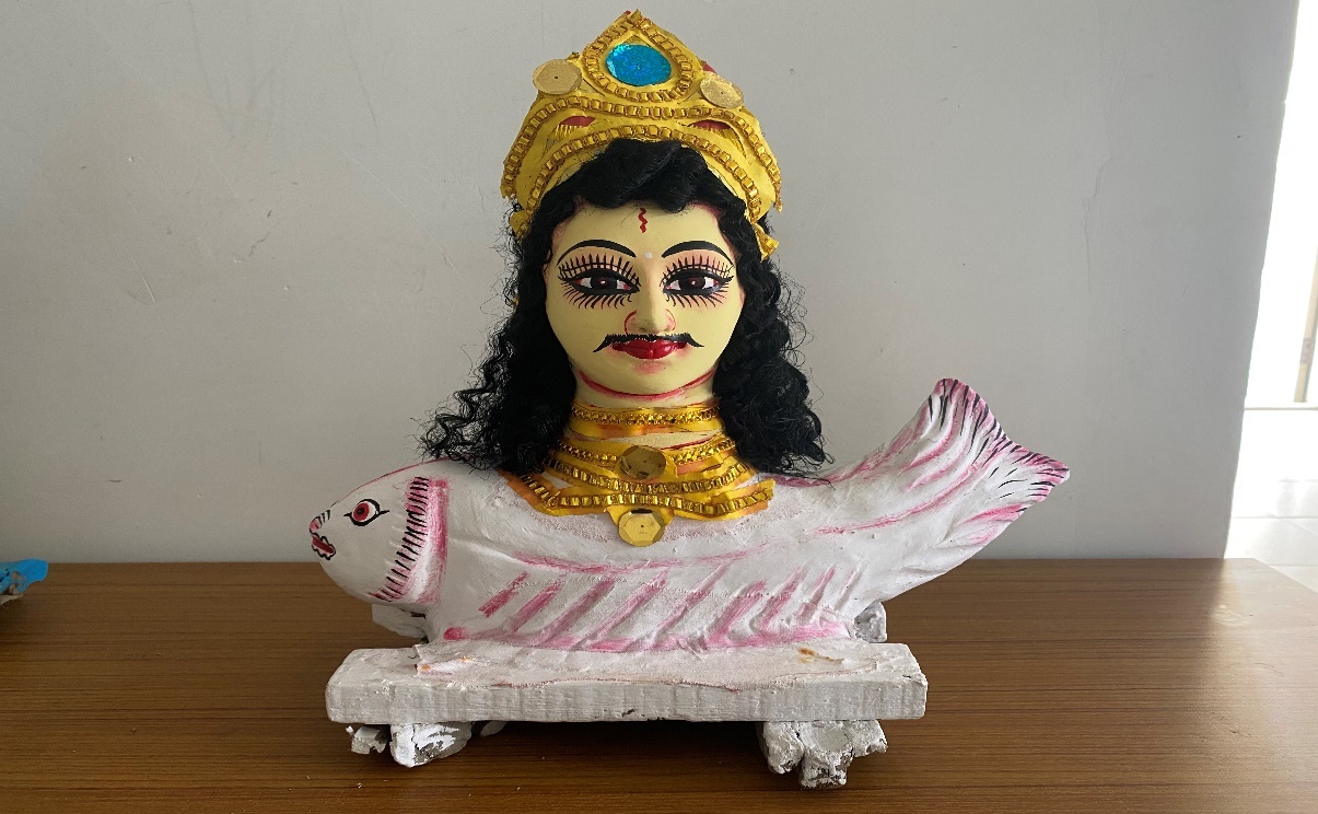 I heard from my father, who had, in turn, heard from the village priest that Durga’s son once had a squabble with his father Shiva. In anger, he severed the son’s head which then flew and stuck on the back of a fish in the sea. From thence, he somehow became the mācher rājā (king of the fish), Makal ṭhākur. And this is why people worship him, and this is the widespread belief regarding this (deity). . .This year I received around eight to ten orders to prepare the icon of the deity in this form. In our area (village), almost all the bherī owners possess this form of the deity. Usually, the Hindu bherī owners do it. From the Āśbin and Kārtik Mās (between mid-September to mid-November) onward, the process of excavating/draining most of the ponds begins, and this is when most of the pūjā will happen here. I recently received an order where somebody asked me to prepare two of this deity. (Interview, August 19, 2021)