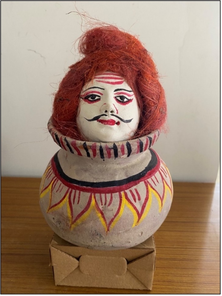 From the field interviews, it was evident that each of the deity’s iconic forms was supported by an oral story that the artisan had either heard within the community or inherited as part of the family tradition of the image-makers. The oral stories play a crucial role in determining the physical features of the deity’s iconic form. For instance, the maker of Figure 6, a forty-five-year-old Hindu man from Minakhan in North 24 Parganas told me that,