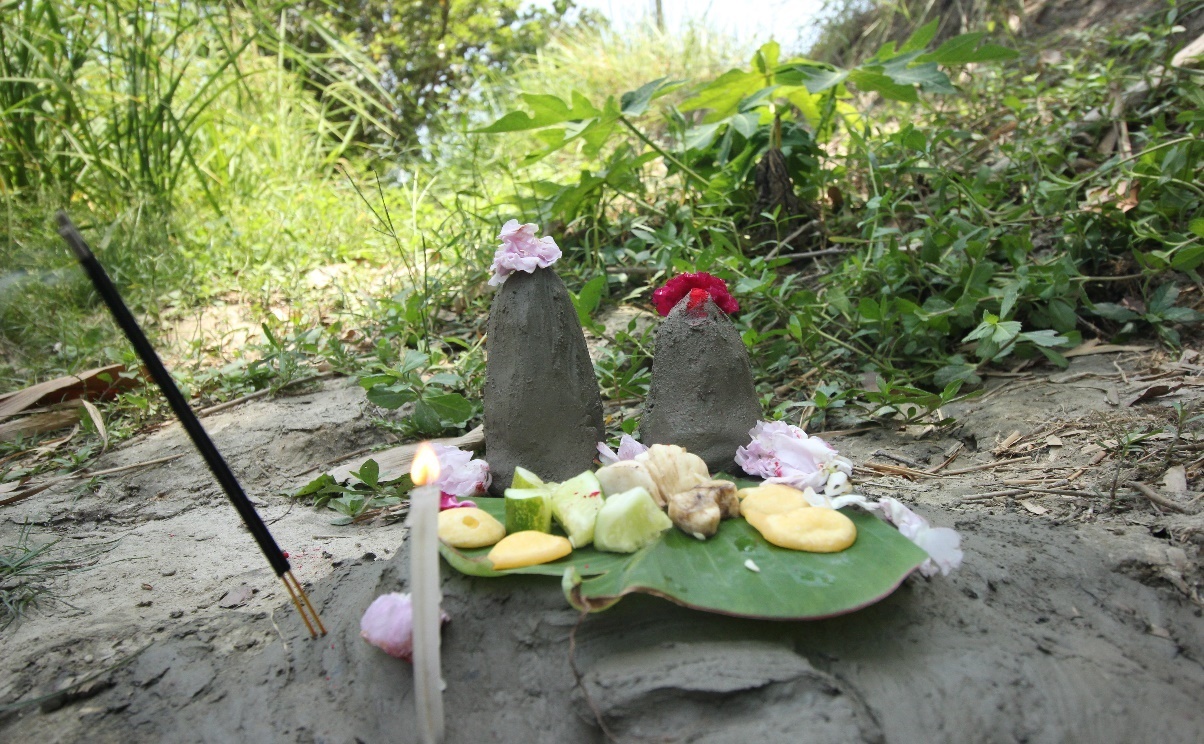 Makal has no vāhana (vehicle) or attendant, unlike many other more mainstream deities in the Hindu pantheon.[16] The northeast direction of a pond is usually selected to install the deities’ stūpas. It is customary to construct them under the open sky near a pond bank. Upon the installation of the stūpa, the pond bank becomes the ṭhākursthān (the sacred site prepared for installing the deity’s stūpa) for ritual offerings made to the deity. Once the pond is ready, the fisher adulates the makeshift shrine of Makal ṭhākur with offerings, consisting of bātāsā (a small crispy sweet cake), sindūr (vermilion), dhunā (incense sticks), mombāti (candle), gānjā (cannabis), ātapcāl (sun-baked rice), Tabernaemontana divaricata (tagar flowers), and some sort of phal (fruit), especially kalā (banana). After making their offerings, the farmer requests (prārthanā karā) that the deity be merciful and allow for a plentiful catch from the pond.