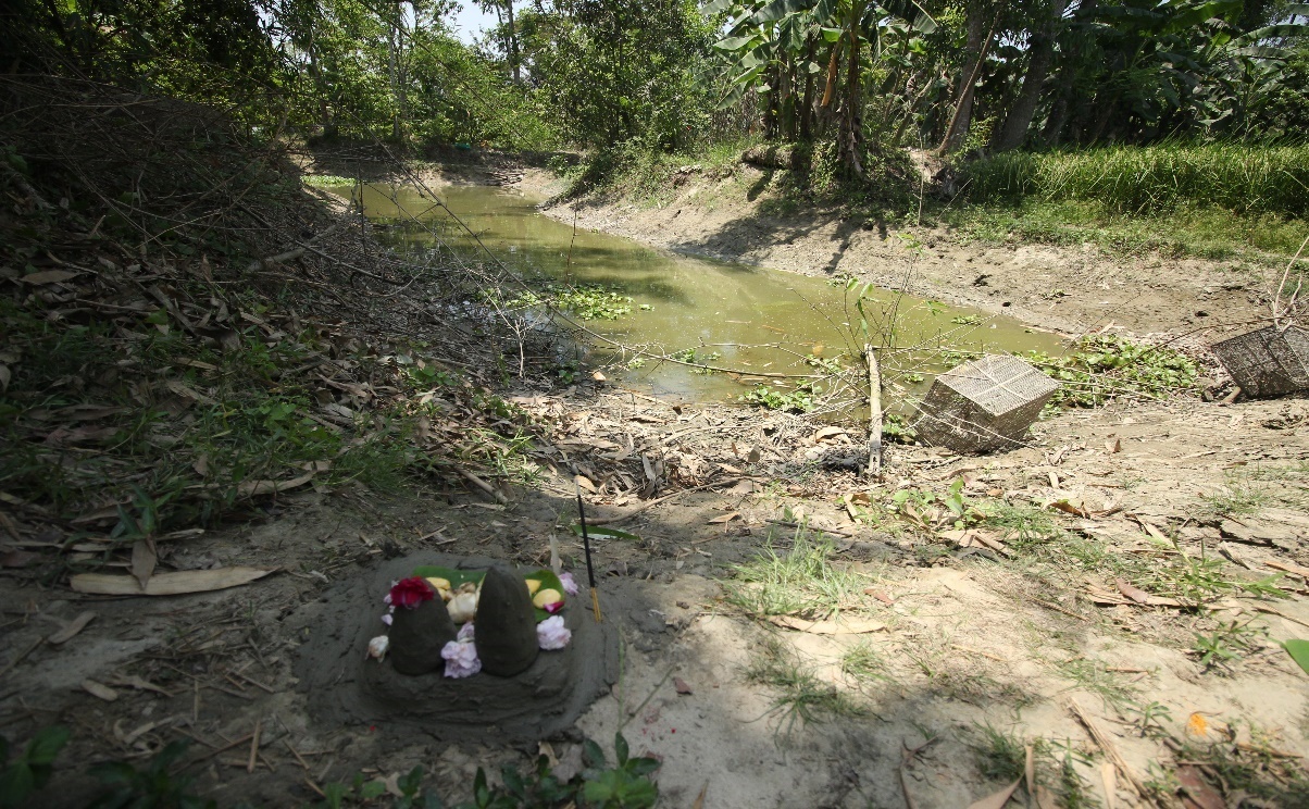 At the pond bank, the locus of worship, I found no custom of balidān (animal sacrifice) or any placatory offering. Neither the stūpa nor the icon is destroyed or immersed after its preparation; they usually succumb to the tide of time unless renewed (either annually or otherwise). There is no custom of reading any hagiographic punthi (punthi-paṛā) during the ritual nor any ṭhākurer boi (holy booklet) enumerating the ācār or pūjā paddhati (ritual conduct) to appease the ṭhākur either. After the ritual, the fisher begins installing the mechanized kerosene-run pumps near the ṭhākursthān to drain the pond water. Afterwards, the fisher and his coworkers collect the fish lying on the pond-bed. They consider this a pāonā (claim to the gift) from the deity.