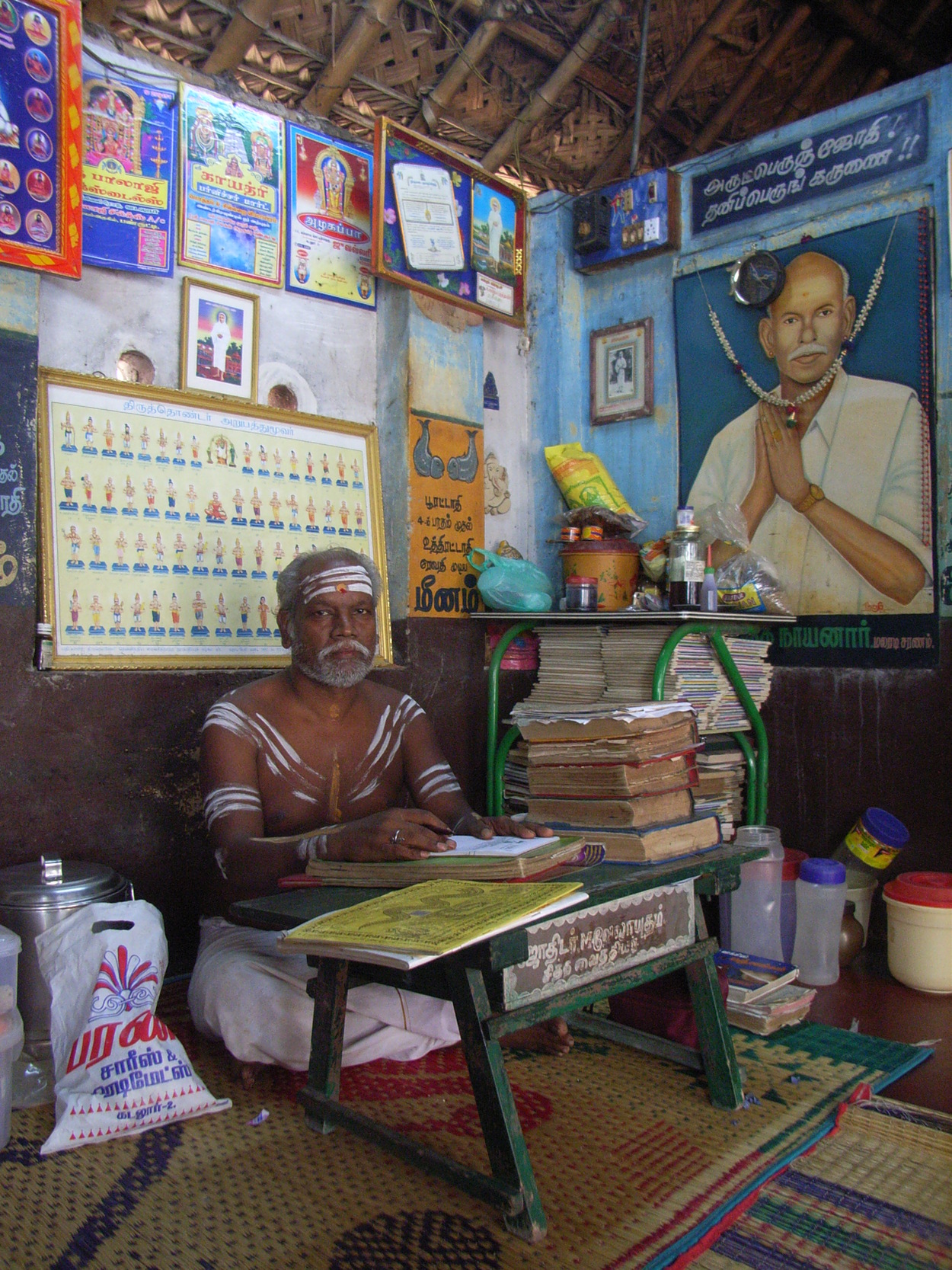 In this article, I propose to revisit the largely forgotten topic of therapeutic astrology—an area surprisingly neglected in recent years—first developed in the influential work of Robert Perinbanayagam (1981, 1982) and Judy Pugh (1983); namely, the study of the healing dimension of astrological consultation located in the performative efficacy of the practitioner. I would like to enrich this discussion by offering new perspectives through the case study of a horoscopic consultation, part of which is chanted. This study is largely based on materials collected during nineteen months of ethnographic fieldwork conducted primarily in the region between Cuddalore, Kumbakonam, and Karaikal from 2006 to 2012. The focal point of the research was the temple of Vaitheeswaran—located twenty-seven kilometers south of Chidambaram—which is known as one of the temples dedicated to Mars (aṅkārakaṉ), one of the nine planets (navakkirakam). More famously, however, it is known as the capital of the lucrative nāṭi astrology business.[2] During the many months of my fieldwork, I traveled around the region on the buses of the Tamil Nadu State Transport Corporation, accompanied by David Chakravarty (Chaku), a research assistant. I sought to conduct a monographic study on the Vallavur caste and to investigate their traditional occupation (toḻil), which is the practice of astrology (cōciyam) and vernacular medicine (maruttuvam). I studied a group of approximately thirty Valluvar astrologers and their families. Of these practitioners, I worked most intensively with seven, observing and recording many of their consultations. The analysis presented here examines one such consultation, conducted with Manikka Velayudham in Sanniyasipettai, a village in Panruti taluk, in August 2008. This specific consultation was selected because it provided a compelling example of my overall observations during fieldwork, while also meeting the article’s practical criteria for conciseness. Drawn from a corpus of approximately fifty recorded consultations, all documented in the presence of myself and Chaku, the material presented here comes from sessions that we transcribed, transliterated, and translated collaboratively after each return to Pondicherry, which served as my fieldwork base. The transliterated excerpts of spoken Tamil presented here may thus reflect the dialectal diversity of the language, with some variations that can be attributed to the region or community affiliation of our interlocutors.[3]