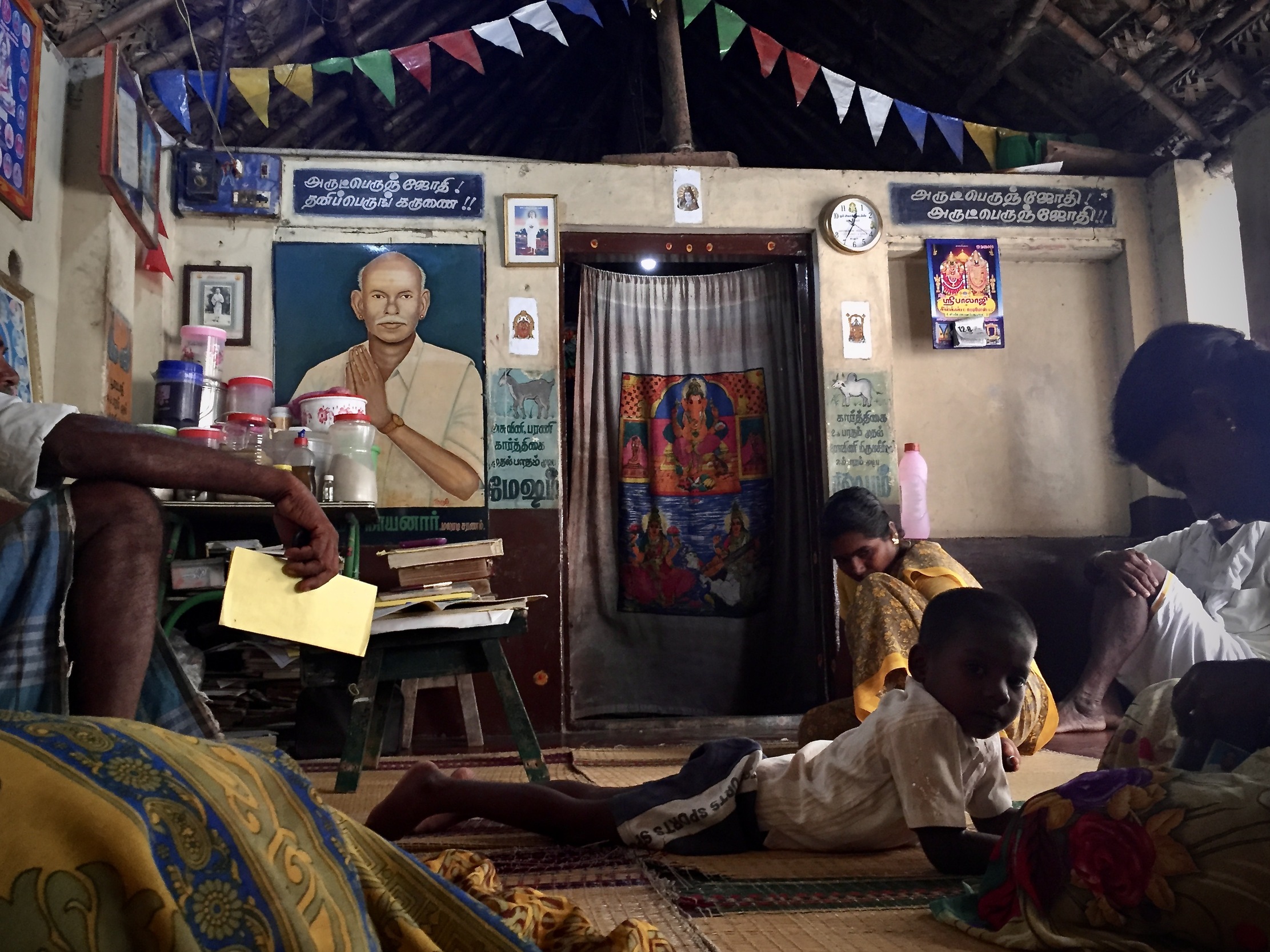 Manikka Velayudham, like some Valluvar astrologers I met during my fieldwork, is part of this Tamil poetic tradition. He receives his patients under an open-air porch (tiṇṇai) adjacent to his house, which is specially dedicated to astrological consultations. As soon as one enters the tiṇṇai, signs and other astrological symbols adorning the pillars of the space are immediately noticeable. They clearly delineate the consultative space, imparting a certain solemnity to it. This atmosphere of gravity and respect is reinforced by the numerous religious representations surrounding Manikka, notably those of the sixty-three Nayanars (nāyaṉār)[5] behind him and of Vallalar above him, reflecting the local spiritual lineages within which the practitioner situates himself.[6] Vallalar’s prayer—aruḷ perum jōti—is inscribed in several places below the ceiling of his porch where he conducts his consultations (Figure 1). The tableau’s final touch is Manikka’s private altar, located in a small dark room to his left that is closed off by a curtain. There, he performs various healing and corrective rituals following his consultations, when necessary (Figure 2). From an autochthonous perspective, all these markers contribute to establishing the soothsayer’s tiṇṇai as a delimited ritual space (Flueckiger 2008, 49–52).