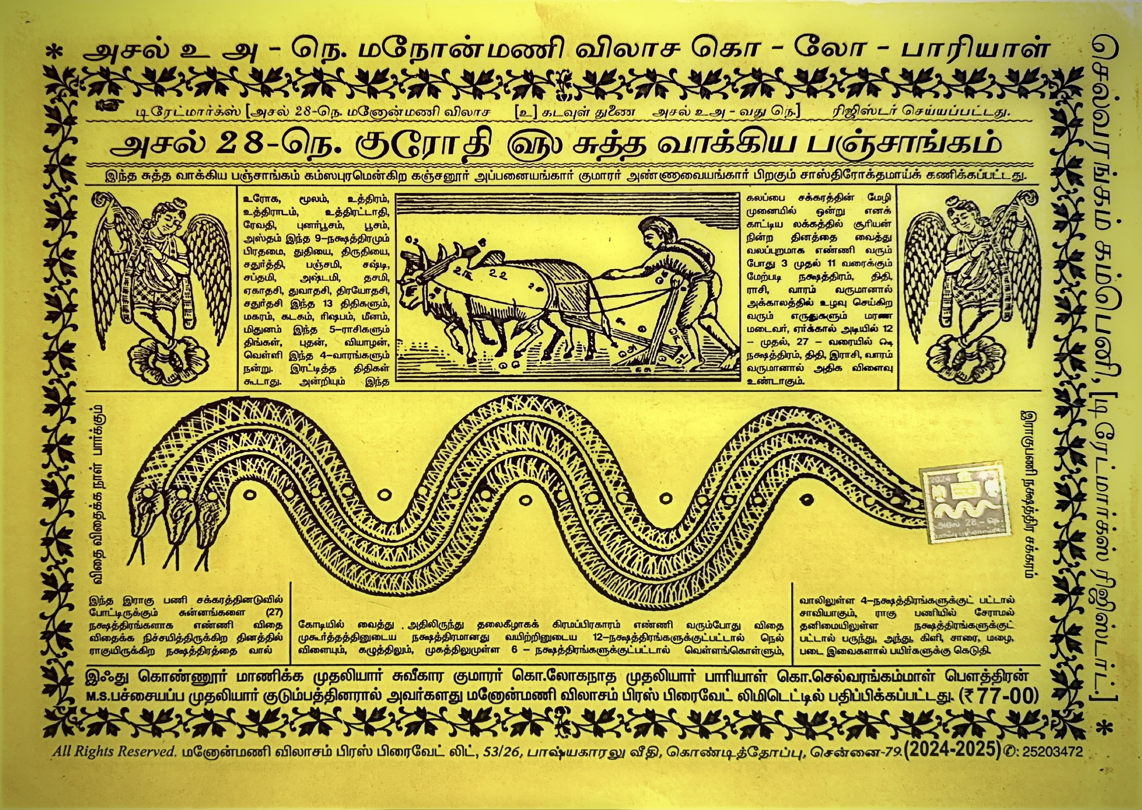 A Mudaliyar family has been publishing this text since 1884 with Manonmani Vilasam Press. It is what is known as a vākkiya pañcāṅkam, an almanac based on mathematical data derived from a simplified astronomical calculation system called Parahita, developed by the Keralite astronomer Haridatta in the seventh century (Pingree 1981, 47). One of the major works of this “method” of astronomical calculations is the Vakyakarana, an anonymous fourteenth century Sanskrit treatise composed near Kanchipuram (ibid., 48), still used today by those who produce Tamil vākkiya pañcāṅkam (Kuppanna Sastry 1989; Sarma 1985, 13–14). Today, in the rest of India, the creation of almanacs is based on data derived from direct observation of celestial bodies (dṛka gaṇita in Hindi, tiru kaṇitam in Tamil) to avoid errors that may be contained in the algorithms of ancient treatises. Therefore, there are slight differences between tirukaṇitam pañcāṅkam and vākkiya pañcāṅkam, with the latter often being regarded as containing inaccuracies by proponents of the former. However, vākkiya pañcāṅkam are also regarded as “authentic” or “traditional” almanacs, as shown by the Tamil terms cutta (pure, true) and acal (original) printed on the cover of the Pāmpu Pañcāṅkam.