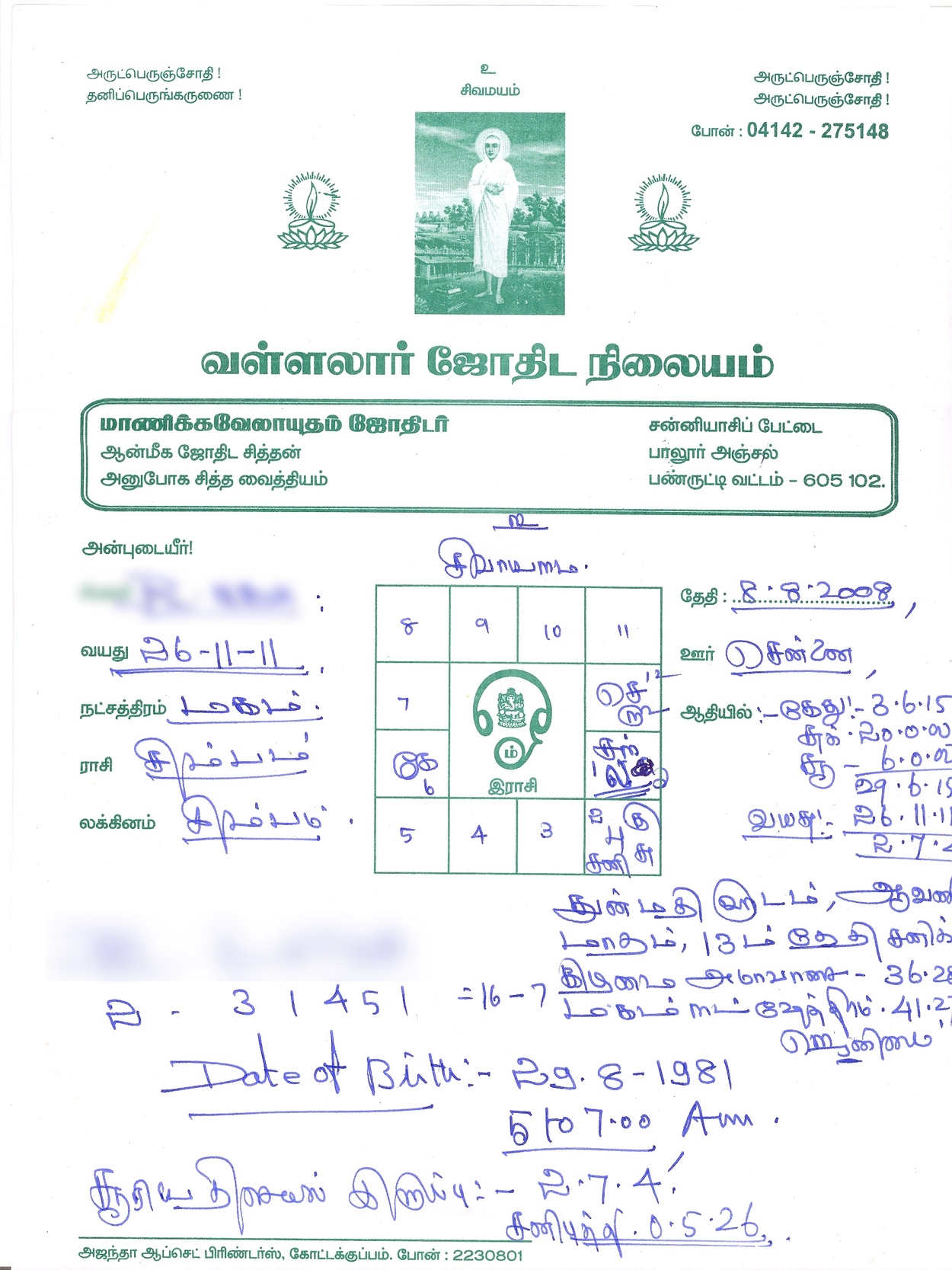 M: In the beginning of January 2009. You will be completing your twenty-seven years on August 27. But you will still experience the effect of the panic life till Markali (mārkaḻi) 13 [December 28, 2008]. So, the return to a good life will begin in January 2009. If you get married at that time, you will have a marital life—good understanding and a pleasant relationship with your husband. You will live according to your wishes. If you do it before, for various reasons, you cannot lead a happy life. You may feel happy at the beginning, but that marriage will not satisfy you fully. Stay cautious, because people surrounding you will try to marry you before that good period. Hence, from January to February is the suitable period. The effects of Raku tōṣam and amāvācai titi [the new moon] will be following you. This astral combination won’t allow you to lead a pleasant life. We tend to think that any problematic situation ends at one time or another, but in your case, it may last longer than expected by creating some other problems related to marriage. Whatever we may say about your future wedding, keep in mind that some things, some obstacles may still occur. It is the nature of individuals who have Ketu in the sixth house. It is bad luck that has been pursuing you since birth. This misfortune started with your birth. People born on amāvācai titi have troubles of all sorts and must face unpleasant situations, obstacles in major life events. They lead a dull life, even if they try their best to avoid troubles. These are all the main characteristics of amāvācai titi. [Silence] However, I can assure you that a marriage will occur in your life…